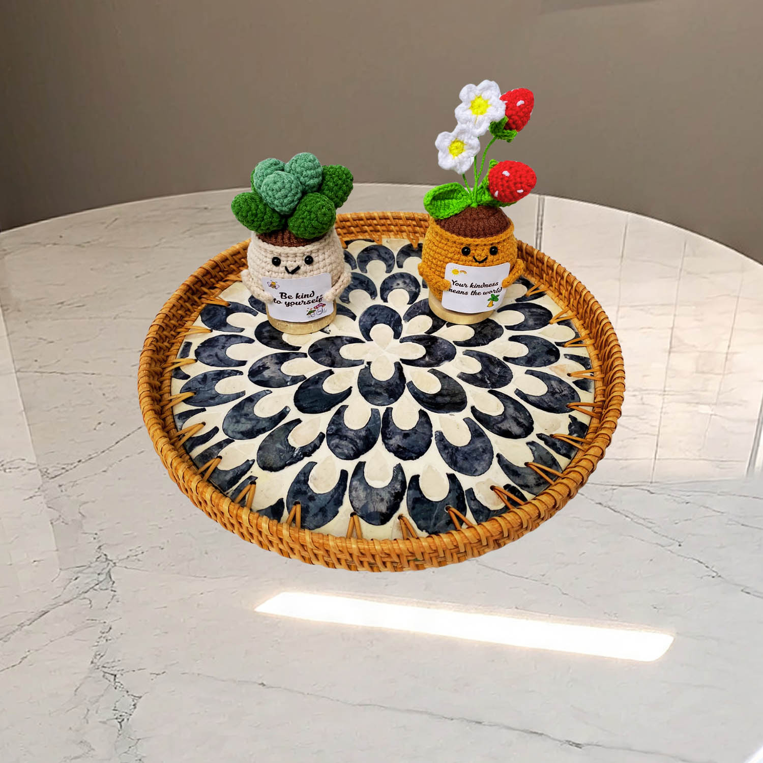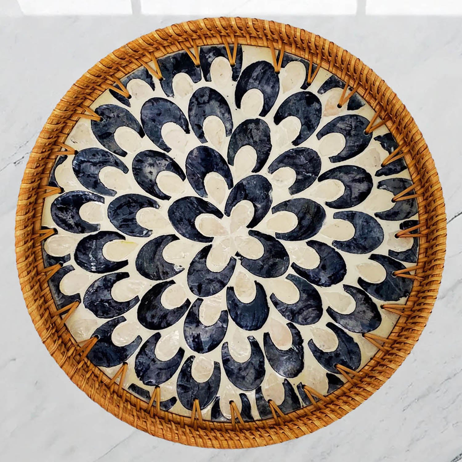 11.8' Wicker Round Rattan Mother of Pearl Serving Basket Tray for Décor Coffee Table (Black Moon)