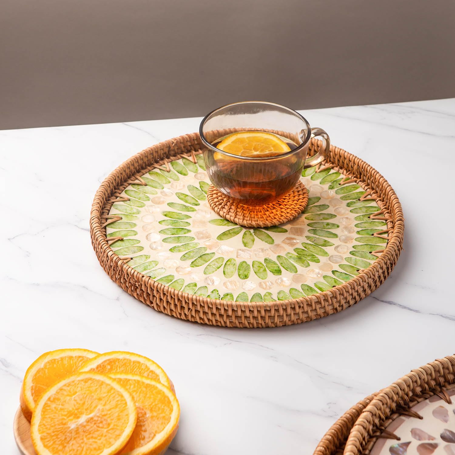 🍃 [Natural Material] It's well-made by 100% natural rattan, how exquisite the products made from the material are with its high durability. Futhermore, the mother of pearl layer inside leaves no scratches on the table surface during usage.