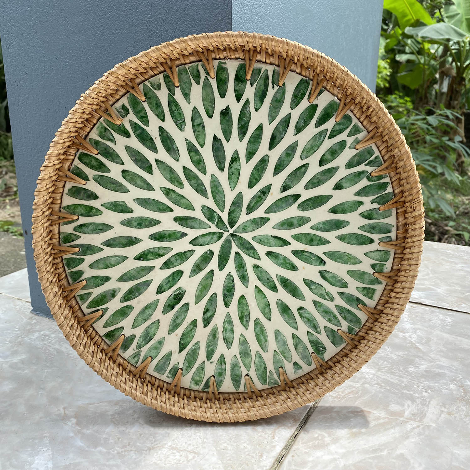 11.8' Wicker Round Rattan Mother of Pearl Serving Basket Tray for Décor Coffee Table (Green Leaf)