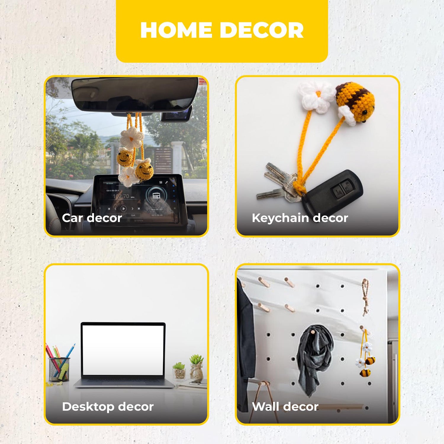 Crochet Hanging Plant For Car Ornament, Accessories for Rearview Mirror, Hanging Car Charm, Gift for Her, Crochet Plant Hangers Accessories For Women, Girl Car, House Decoration (Yellow Bee with White Flower)