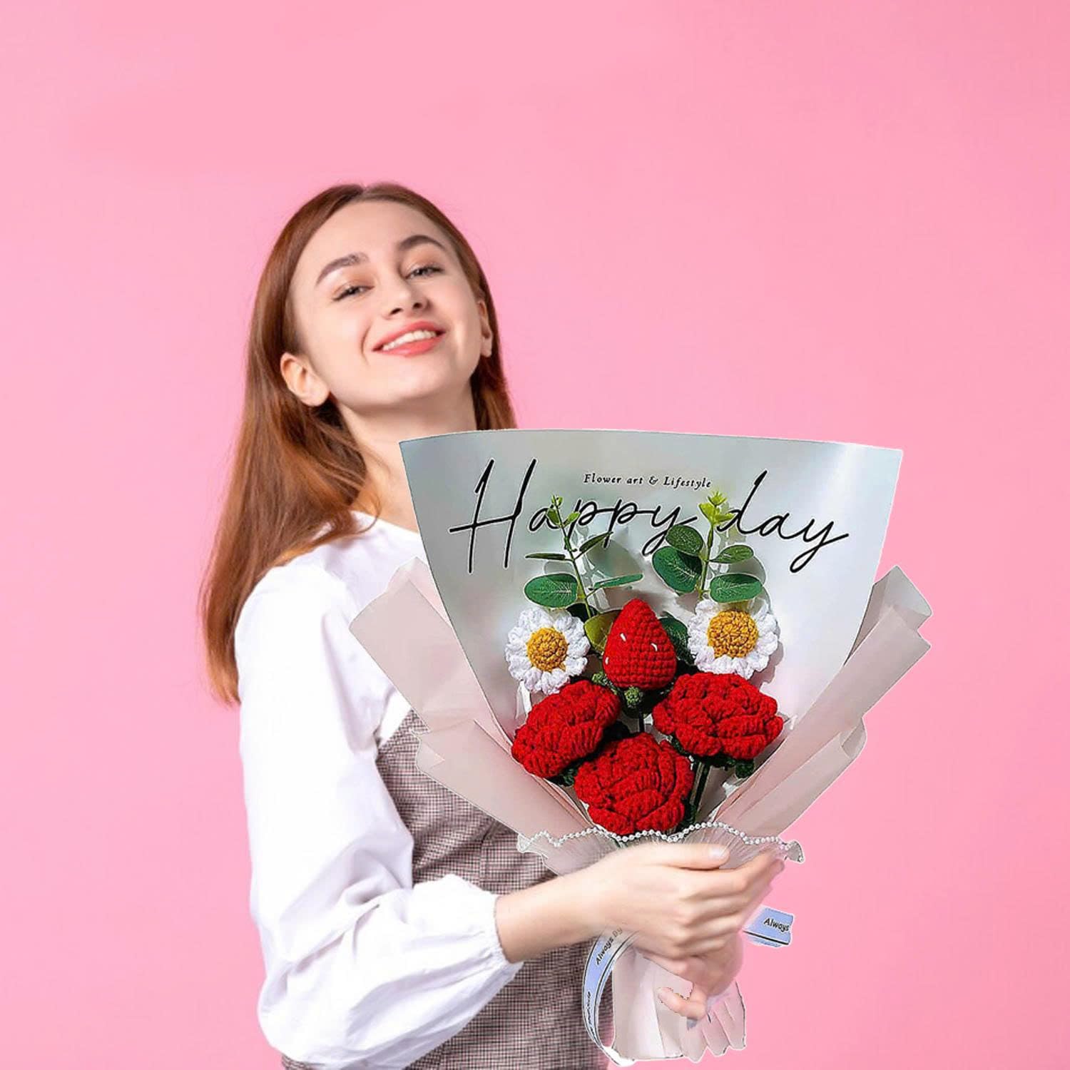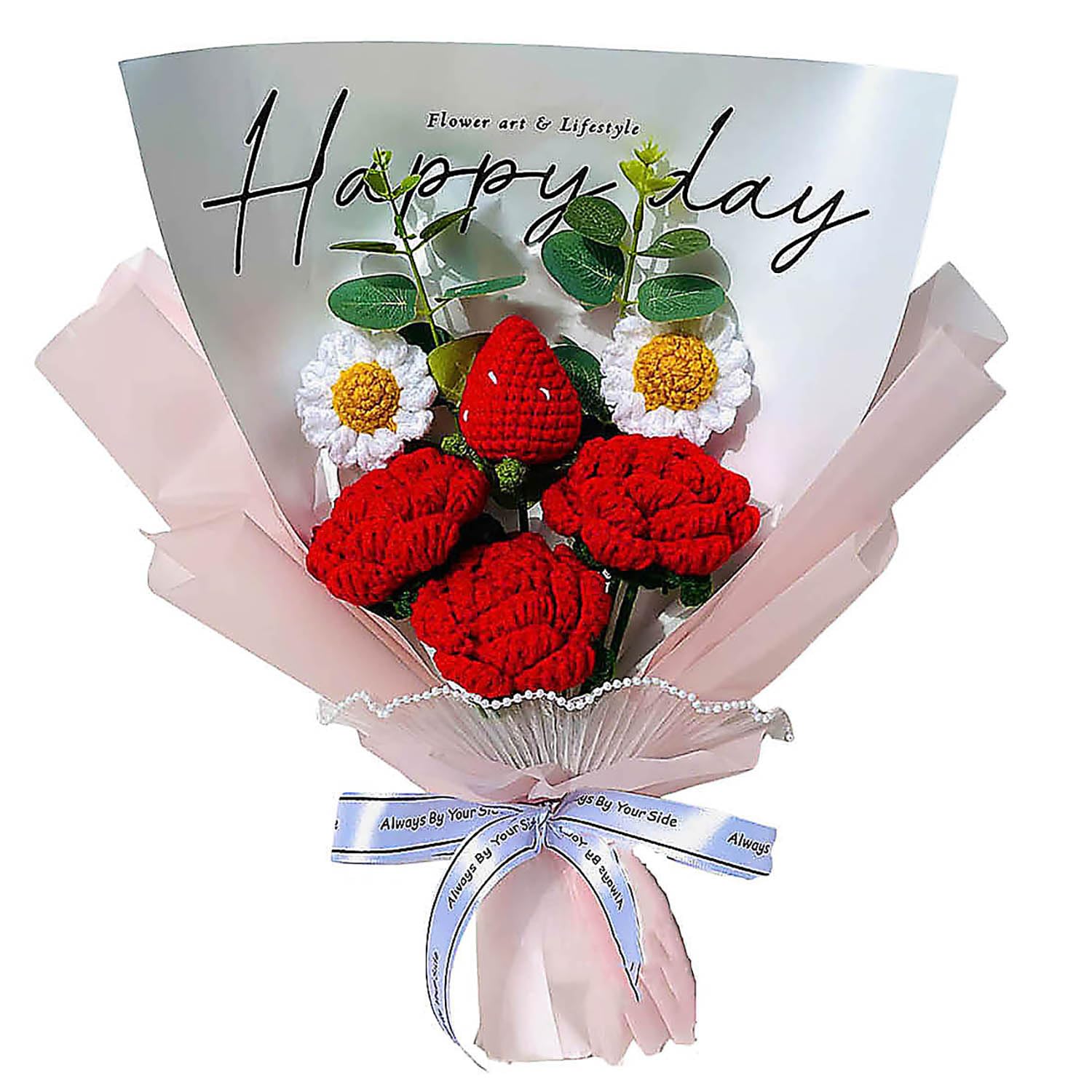 🌿Handmade Crochet Flower Bouquet | Artificial Completed Knitted Flowers of Roses, Daisy, Birthday Gift, Mother's Day, Valentine, Wedding, Home Décor (Red Rose & Strawberry).