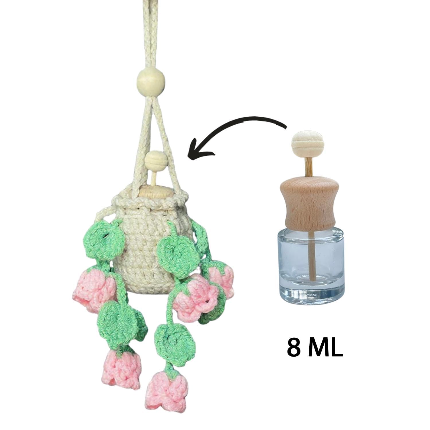 🌿DUALLY FUNCTIONAL: This auto air freshener includes a car diffuser holder with a car diffuser bottle in a cute crochet handing plant pot design, creating a natural feel. You can enjoy the fragrance of oils while decorating your car.